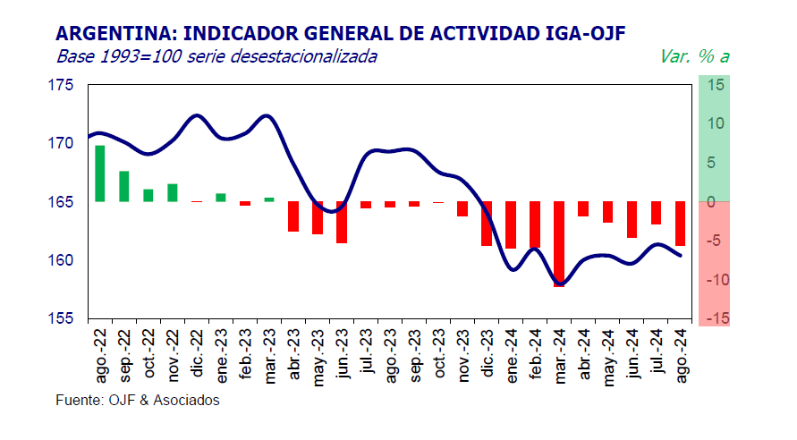 El Estimador Mensual de Actividad Económica (EMAE) del INDEC arrojó en julio una caída del 1,3% anual, pero una mejora del 1,7% desde junio. Los datos privados que se conocieron a partir de entonces fueron malos. El Índice General de Actividad (IGA) de la consultora Orlando Ferreres (OJF) marcó en agosto una caída del 0,6% mensual y del 5,6% interanual. La consultora Equilibra estimó una retracción del 0,4% contra el mes previo y del 4,5% anual.