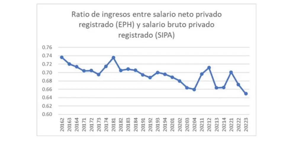 El otro elemento que podría explicar esta paradoja es la subdeclaración de los ingresos. Como muestra Daniel Schteingart acá, efectivamente se observa este fenómeno al comparar los ingresos que provienen del Sistema Integrado Previsional Argentino (SIPA), que salen de los recibos de sueldo informados por las empresas, y aquellos provenientes de la EPH, que surgen de lo que las propias personas declaran que ganan.