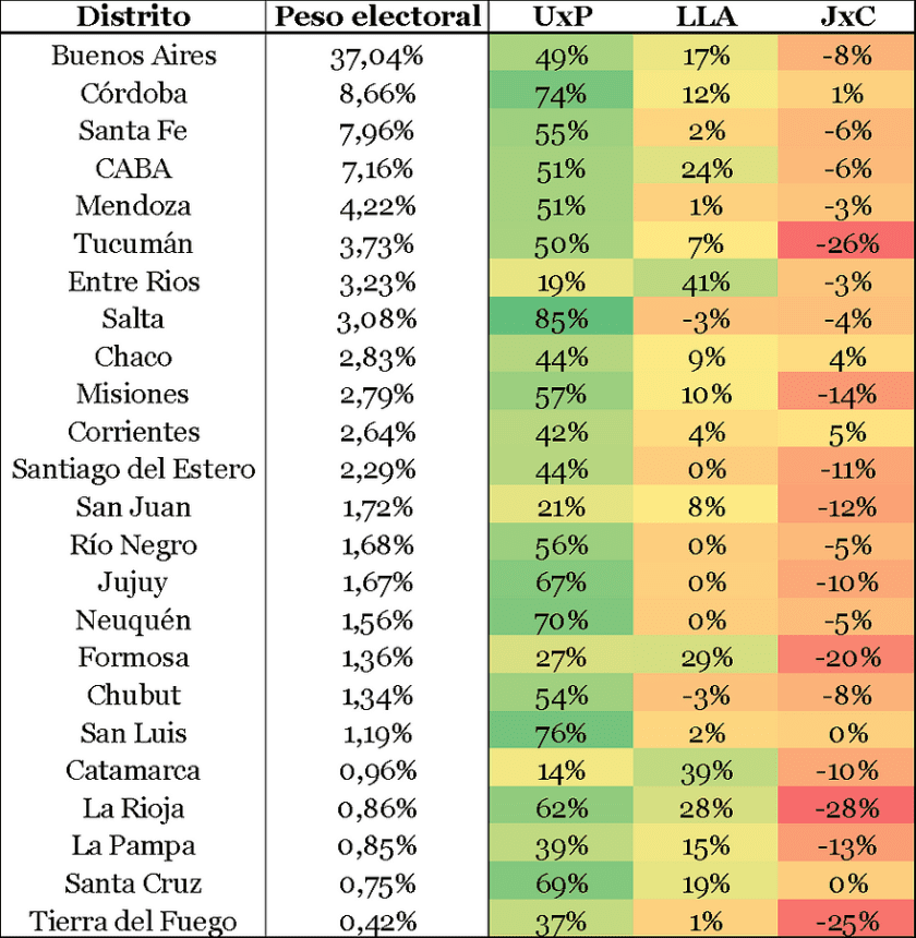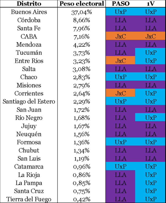 Y los datos son argumentos de afirmación para lo nuevo que viene. El oficialismo mantuvo las 5 provincias donde había salido primero en las PASO de agosto (provincia de Buenos Aires, Catamarca, Chaco, Formosa y Santiago del Estero) y dio vuelta 8 más: Corrientes y Entre Ríos (conquistadas por Juntos por el Cambio dos meses atrás), y La Pampa, La Rioja, Río Negro, Santa Cruz, Tierra del Fuego y Tucumán (por La Libertad Avanza). Acá podés verlo ordenado por peso del padrón electoral distrital, que representa cuántos votantes de todo el padrón nacional pueden concurrir a votar en cada provincia.