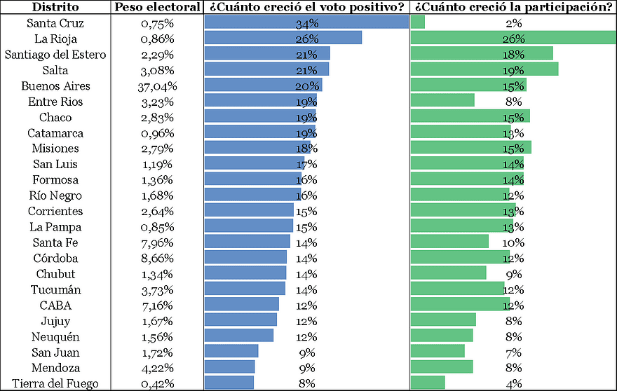 El primer hallazgo es lo ocurrido en Santa Cruz. El salto de un 34% en el voto positivo no condice con el 2% de aumento de la participación electoral. La explicación es el voto en blanco. Fue a emitir su sufragio una porción levemente mayor de la ciudadanía, pero ahora lo hizo tomando una de las boletas del cuarto oscuro. Los santacruceños no dejaron tantos sobres vacíos el domingo pasado como lo hicieron 8 domingos atrás. Algo similar ocurrió en Entre Ríos, pero en una magnitud menor (19% de salto positivo y 8% de salto participativo). En el resto de los distritos los guarismos tienen mayor similitud. En términos generales, el salto fue más homogéneo en cuanto a participación, y más dispar en lo que respecta al voto positivo.