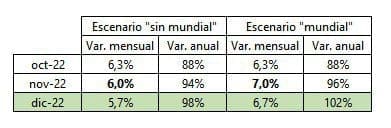 Supongamos que el Mundial impacta en la inflación de noviembre, llevando a que sea un punto porcentual (p.p.) más elevada de lo que hubiese sido de no haber Copa del Mundo (en realidad, afectaría mitad de noviembre y mitad de diciembre, pero para simplificar las cuentas). Además, supongamos que en diciembre se reduce 0,3 p.p. por la aplicación del programa “Precios justos”, en línea con las expectativas del gobierno.