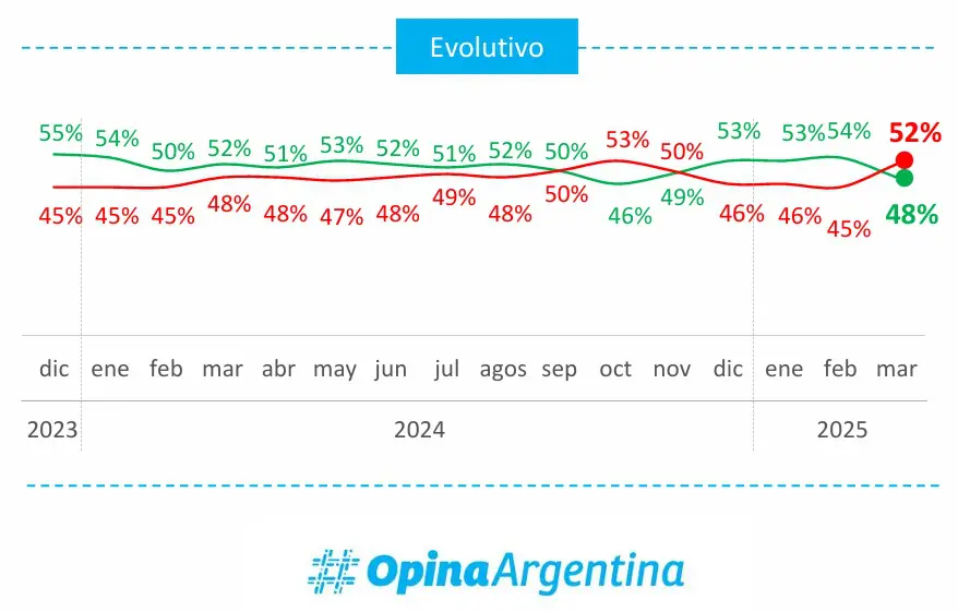 Un dato recurrente: en el subibaja de la opinión pública, en general no fue determinante la acción de la oposición. Quizás el único hecho fue la primera marcha universitaria, mayoritariamente silvestre, que tuvo más impacto que la segunda, donde distintos actores, como Unión por la Patria y la Unión Cívica Radical de Martín Lousteau, se subieron. Hay cierta autocrítica en el peronismo sobre aquella decisión. El peor momento en la opinión pública ocurrió en octubre y fue por el veto a jubilados y a los fondos universitarios. Pero además, en un contexto de cuatro meses en los que la inflación dejó de caer y se mantuvo arriba de los cuatro puntos.