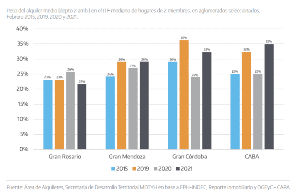 Un indicador clave es la evolución del peso del alquiler en los ingresos. Entre 2015 y 2021 ese peso (el cálculo está hecho en base a un departamento de 2 ambientes) aumentó en todos los aglomerados urbanos, excepto en Rosario, donde disminuyó un punto porcentual. En la ciudad de Buenos Aires es donde el aumento fue más profundo: pasó del 25% al 35% en solamente seis años.