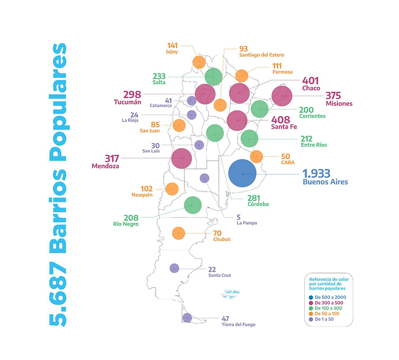 Por ley, la SISU trabaja sobre aquellos barrios relevados en el Registro Nacional de Barrios Populares (ReNaBaP), creado en 2017 y confeccionado entre el Estado y varias organizaciones sociales. Según ese relevamiento, que se actualizó en 2021, en Argentina hay 5.687 barrios populares donde viven más de un millón de familias (más de 5 millones de personas). Se calcula que alrededor del 6% de las viviendas del país están en una villa y que la proporción de personas se acerca al 12%, lo que da cuenta del alto hacinamiento en la mayoría de estos barrios. Muchos de estos datos los podés consultar acá y jugar con ellos.