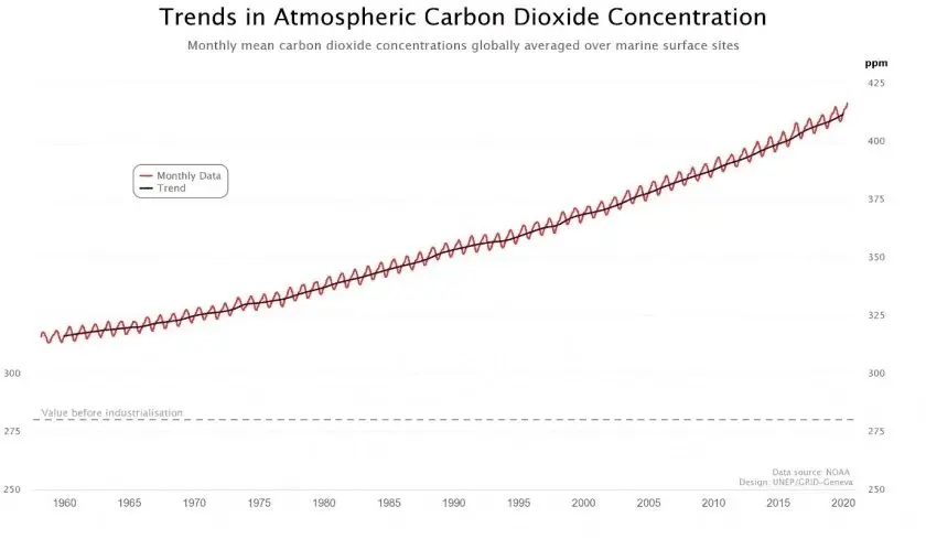 El siguiente gráfico muestra la tendencia ascendente de las emisiones desde que se comenzaron a medir, tarea que se lleva a cabo analizando hielo, ya que las capas de nieve acumuladas durante el tiempo capturan material biológico e inorgánico que permite saber distintas cosas sobre el clima en un momento determinado. La concentración de CO2 en distintas capas de lo que llamamos núcleos o testigos de hielo, pedazos de hielo antártico que en su profundidad tienen hasta 400.000 años, nos muestra la evolución de la presencia de este gas en la atmósfera.
