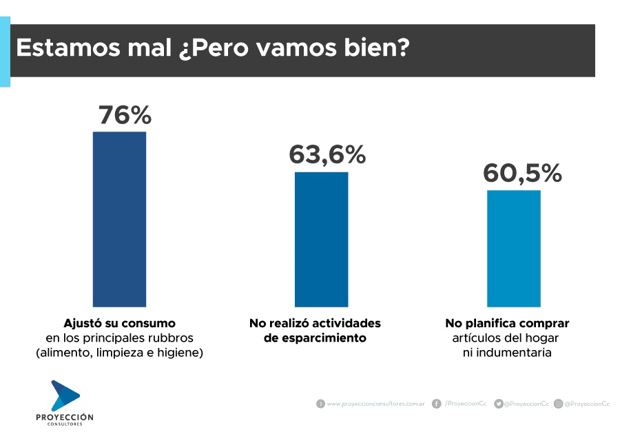 ¿Cuánto tiempo alcanza esa virtud para apagar el deterioro en las condiciones de vida? Proyección midió en julio y reflejó la motosierra familiar forzada en tres indicadores: 63% no gastó en esparcimiento, 60% no piensa comprar ropa ni artículos del hogar y 75% ajustó su gasto en cuestiones básicas como alimentos.