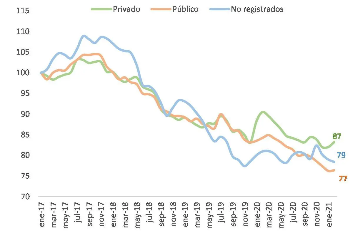 SumateEvolución de los salarios en términos reales (enero 2017 = 100)