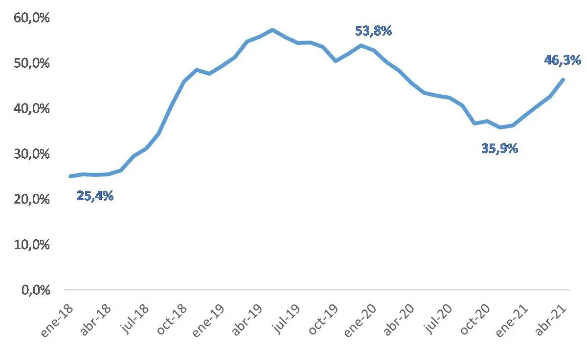 A pesar del aumento inflacionario, el aspecto positivo es que los salarios en su mayoría le ganaron a la inflación. Según el Índice de Salarios (IS) que publica el INDEC, el primer trimestre cerró con una mejora real del 1,3% para las remuneraciones del sector público y del 0,7% para las del sector privado registrado, mientras que las del sector informal se redujeron 2,7%. No obstante, la comparación anual muestra que en todos los casos siguen muy por debajo de los niveles del año pasado: los privados perdieron 7,8%, los públicos 7,6% y los del sector informal 3,7%. Es importante destacar que en los primeros meses del 2020 se habían otorgado aumentos de suma fija, elevando la base de comparación de los ingresos privados.