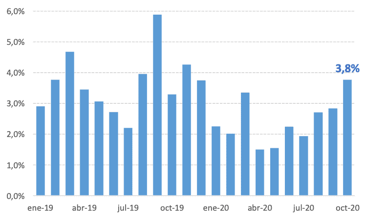 Una semana donde se publicaron muy pocos indicadores, aunque hubo uno muy relevante. El INDEC difundió el IPC de octubre, que a pesar de que se esperaba que diera más alto (el Relevamiento de Expectativas del Mercado –REM- la había estimado en 3,2%), sorprendió por su magnitud. La inflación mensual fue del 3,8% (+1 p.p. respecto del mes anterior), siendo la más elevada desde noviembre del año pasado. En el acumulado del año, la inflación se ubicó en 26,9%, mientras que en términos anuales fue de 37,2%. Como se ve en el gráfico, la inflación muestra una tendencia alcista desde el inicio de la pandemia, con un salto importante en el último mes.
