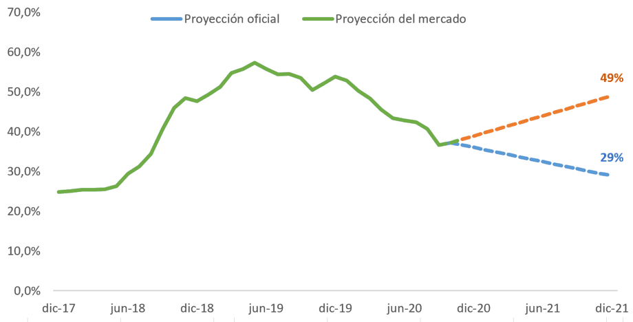 La gran divergencia se explica fundamentalmente por lo que el gobierno espera que suceda con el tipo de cambio oficial, cuyo aumento proyectado es del 25% anual, mientras que el mercado espera que haya una nueva devaluación del dólar, dado que estima una suba del 49% anual.