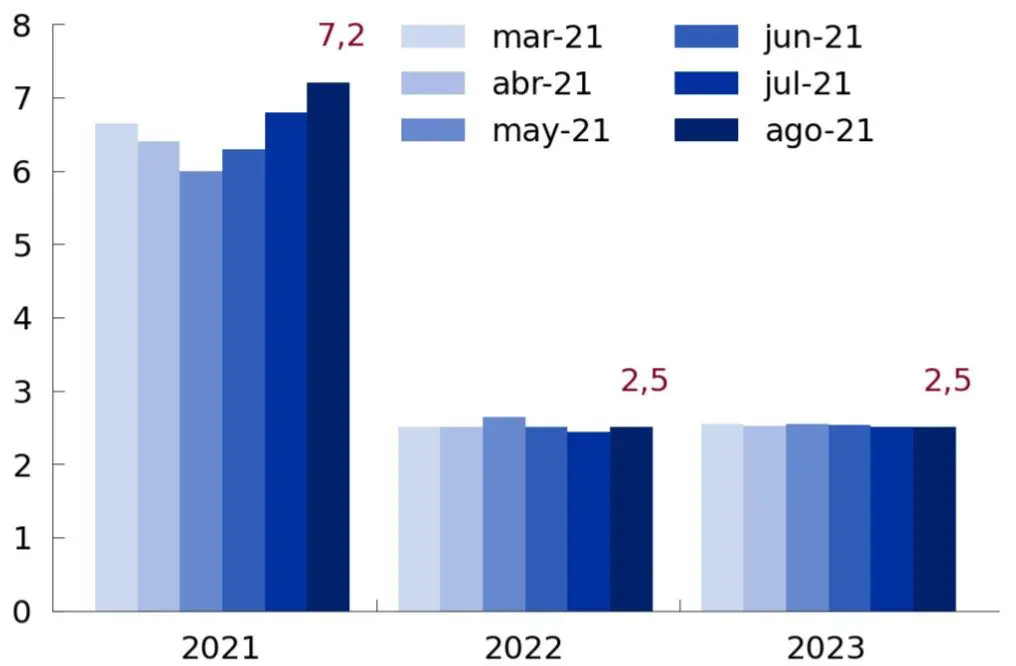 En cambio, las proyecciones del PBI fueron ajustadas al alza para 2021, luego del repunte que está mostrando la actividad en los últimos meses. Así, el crecimiento del PBI estimado para 2021 pasó del 6,8% al 7,2%. Por su parte, aumentaron levemente la proyección para 2022, mientras que la de 2023 se mantuvo constante, siendo en ambos casos del 2,5% anual.