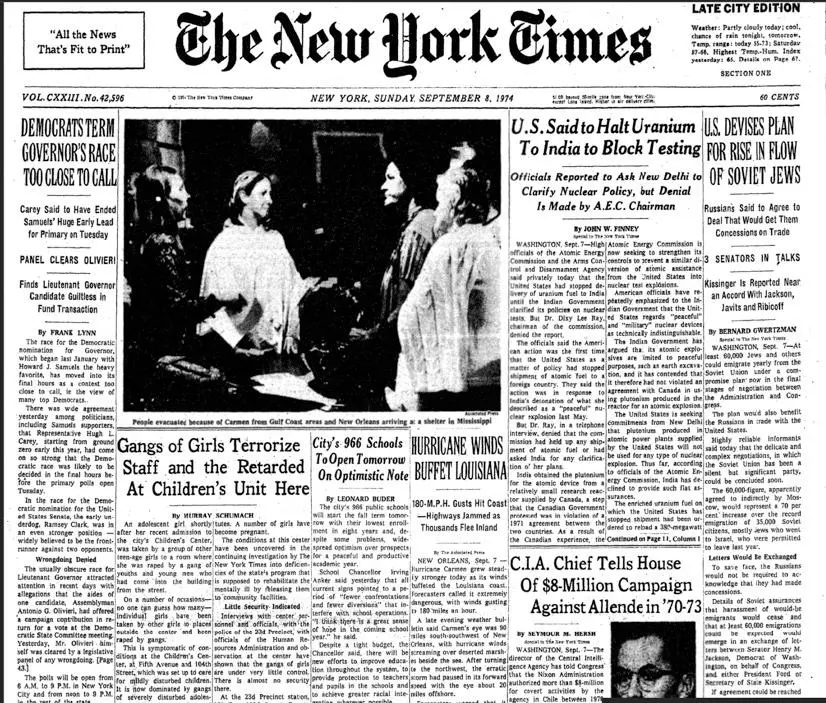 En realidad, la cifra era mucho mayor: en testimonio reservado ante una comisión legislativa, Colby admitió que Estados Unidos había destinado USD 8 millones para financiar actividades encubiertas dirigidas a desestabilizar al gobierno de Allende. El periodista Seymour Hersh publicó la información en la portada del New York Times del domingo, el 8 de septiembre de 1974.