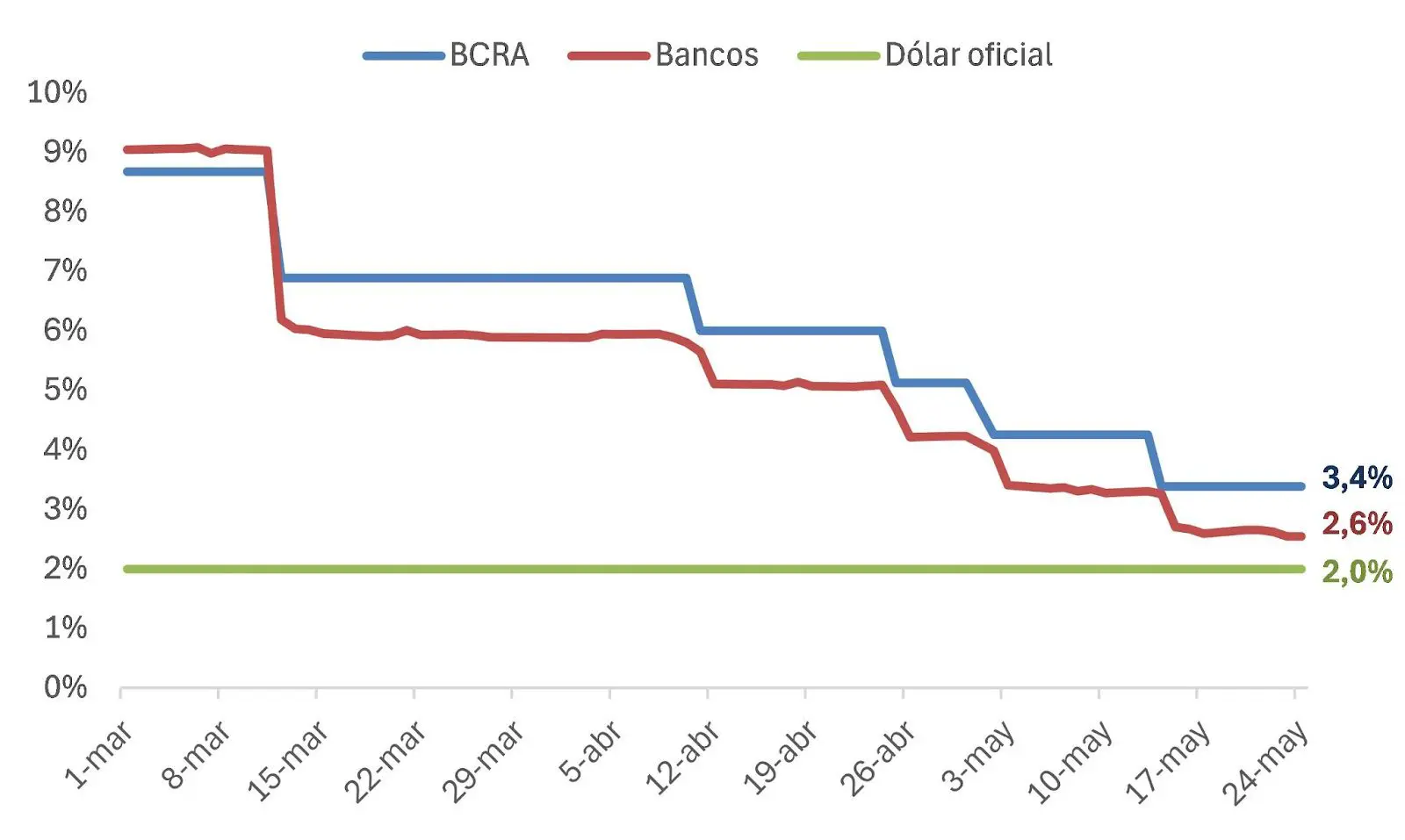 El gráfico también nos sirve para advertir una segunda cuestión que puede ayudarnos a responder la pregunta. Fíjense que las tasas, tanto la que fija el Banco Central como las que ofrecen los bancos, se fueron acercando cada vez más a la tasa de aumento del tipo de cambio fijada por el Gobierno desde su inicio de gestión. Dicho de otra manera, se fue reduciendo sistemáticamente la rentabilidad –medida en dólares– de mantener los pesos en un plazo fijo o instrumento similar (esto aplica todavía más si lo medimos en términos del dólar financiero, que venía aumentando a un ritmo del 1,5% promedio mensual).