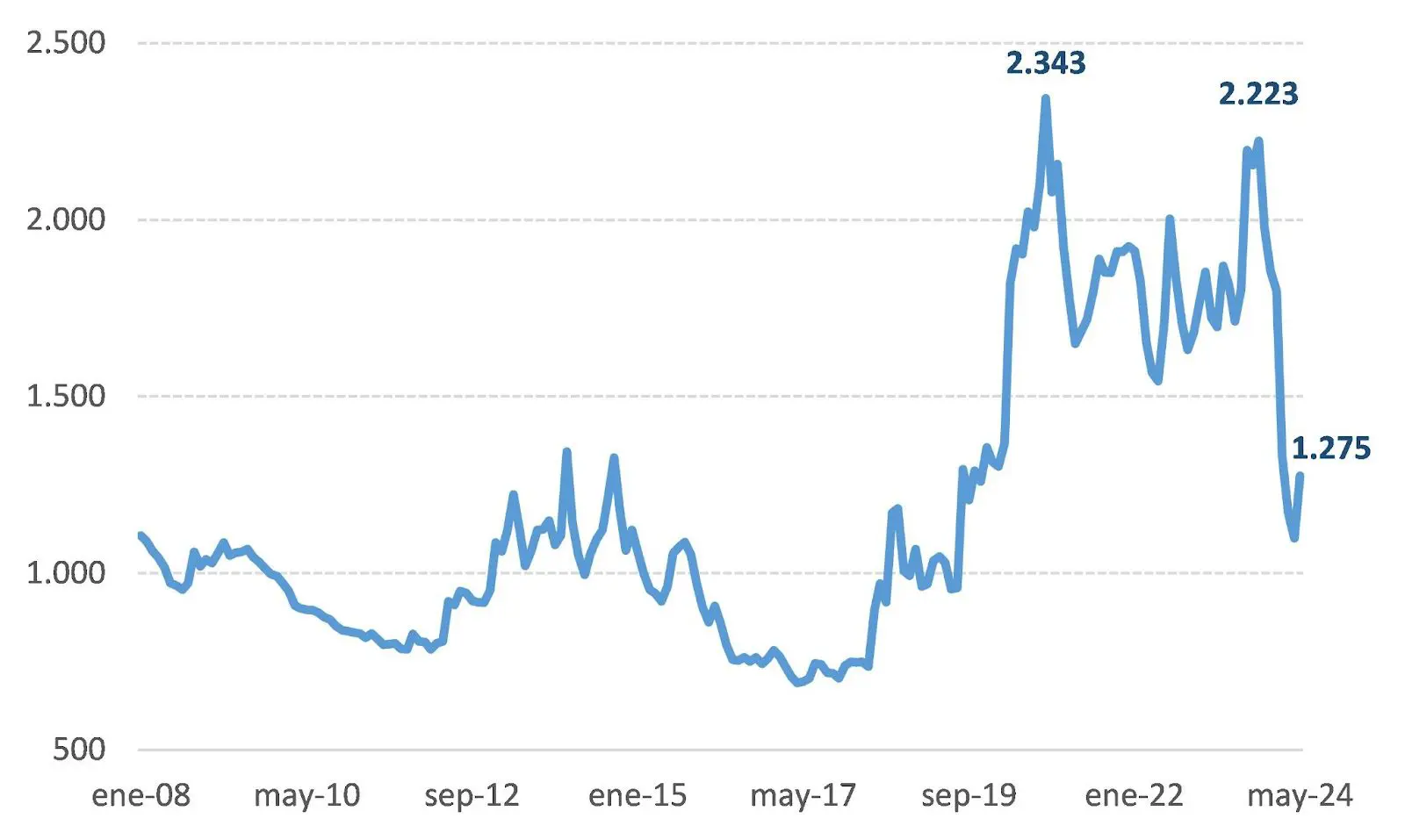 ¿Puede tener algún impacto en los precios? Para responder esa pregunta, primero hay que dimensionar la magnitud del salto cambiario, porque al ponerlo contexto vemos que fue pequeño. En efecto, como pueden ver en el gráfico (que lo que hace es valuar el tipo de cambio informal a los precios de hoy, como para tomar dimensión de sus distintos valores a lo largo de los últimos años y poder compararlo fácilmente con su precio), el aumento de las últimas semanas –y el precio actual en el que se ubica el dólar informal– son bajos respecto de lo que se observó durante los 4 años de gestión de Alberto Fernández (y levemente por encima del promedio de los últimos 15 años).