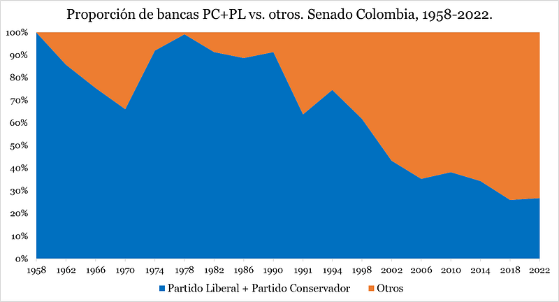 No todo se queda quieto. Cuando se mueven las cosas abajo, entonces arriba algo siempre tambalea. América Latina lo sabe muy bien. Si volvés a ver los tres gráficos anteriores vas a ver que hay un año donde todo cambió para siempre: el 2002. Durante ese año, “se descongeló por completo el bipartidismo”, me cuenta Juan Pablo Milanese, politólogo argentino, profesor titular y jefe del Departamento de Estudios Políticos de la Universidad ICESI (Cali). “El sistema de partidos está fragmentado. No es el escenario de principios de los 2000 y la década de los 90 que, digamos, se pulverizó”, ahonda Sandra Botero, profesora de Ciencia Política en la Universidad del Rosario (Bogotá). Como bien indica la politóloga argentina Margarita Batlle en este capítulo de un libro muy bien dedicado al estudio de los sistemas de partidos en la región, Colombia es un caso claro de pérdida de poder de los partidos tradicionales en favor de nuevos actores políticos que surgieron al calor de la descentralización del Estado. A este proceso contribuyó también un cambio del sistema de boleta partidaria por boleta única, como muestran en este trabajo Santiago Alles, Mónica Pachón y Manuela Muñoz. Liberales y conservadores “llevan más de 170 años activos y son de los partidos más antiguos del continente — agrega Nicolás Liendo, analista político — . El hecho de que las elecciones de congreso y subnacionales sean en fechas distintas, ayudan a estas estructuras a sobrevivir, pero evidentemente cada vez les cuesta más hacerlo. Carecen de nuevos liderazgos movilizadores y están presas a los dictámenes de expresidentes”.