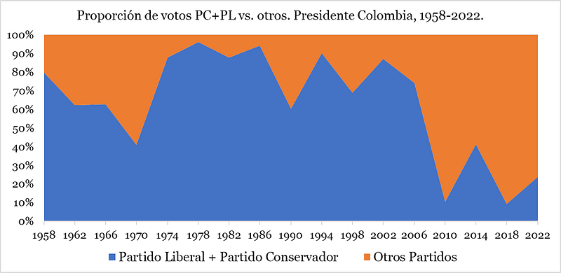 SumateEmpecemos con los gráficos. Acá podés ver la proporción de voto presidencial entre liberales y conservadores sumados vs. el apoyo a otras candidaturas partidarias. El gráfico incluye aquellos años en los cuales alguno o los dos principales no presentaron candidatura propia, pero sí dieron apoyo a otras. En pocas palabras, la sumatoria de ambas muestra cuándo decidieron jugar por alguna figura.