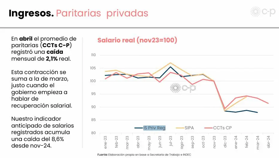 El informe muestra, además, el lado B: el rezago de los salarios, que parecían recuperarse parcialmente en febrero-marzo pero vuelven a caer. Según el indicador de variación salarial que a partir de las paritarias confecciona la consultora C-P, en abril cayó 2,1%. El documento muestra otro dato relevante que frena el proceso de recuperación salarial: en marzo cayó la cantidad de acuerdos paritarios, que tuvo un pico post devaluación en enero, con el 72% de los sectores. En abril, a pesar de la mayor cantidad de acuerdos, el salario negociado cayó respecto de la inflación.