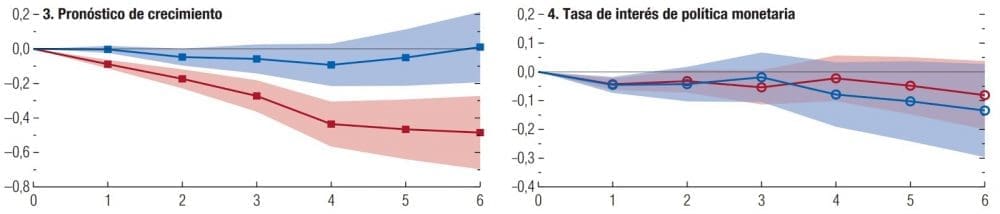 Lo que se desprende de los gráficos a continuación es que se observó una devaluación similar en ambos grupos de países, pero que en el caso de aquellos con expectativas menos ancladas eso derivó en un incremento significativamente mayor de la inflación (lo que se conoce como un “pase a precios” más alto). Ese aumento más elevado de la inflación se tradujo en una caída mayor del poder adquisitivo y por ende en una contracción del PBI más profunda. Por último, a pesar de la inflación más elevada, la respuesta de la política monetaria de esos países fue levemente menos contractiva (la tasa de interés se redujo menos que en los países con expectativas ancladas), pero esto se debe justamente a la caída más profunda del PBI (las autoridades monetarias no querían provocar una recesión aún más grave).