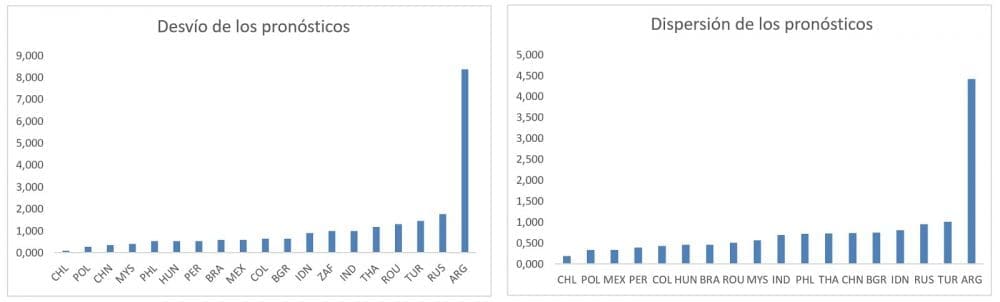 Todo lo anterior sirve para entender lo que se conoce como el grado de “anclaje” de las expectativas, es decir, qué tanto responden esas expectativas ante cuestiones transitorias o aumentos repentinos de la inflación. Y esto se puede medir, justamente a partir del análisis de los pronósticos que realizan las consultoras en los distintos países. En un trabajo reciente del FMI (capítulo 3), el organismo hace esto mismo para los países emergentes, midiendo el desvío de las proyecciones respecto de la meta fijada por las autoridades gubernamentales y la dispersión entre las distintas estimaciones de las consultoras. En ambos casos, cuanto más pequeño es el desvío/dispersión, mejor ancladas se encuentran las expectativas.