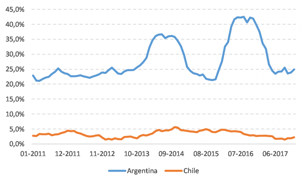 Para poner un ejemplo más concreto, imaginen que hubiese que estimar la inflación de 2018 para el caso argentino y el chileno. Para eso, veamos cómo se comportó dicha variable entre 2011 y 2017 en ambos casos.