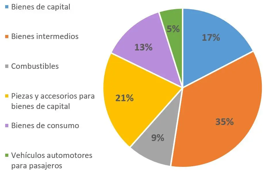 La elevada dependencia importadora queda en evidencia al analizar los principales elementos que componen las importaciones. En efecto, casi el 75% de lo que se importa está vinculado directamente con los procesos productivos: bienes de capital (máquinas, tractores, etc.), bienes intermedios (suministros industriales, alimentos para la industria agropecuaria, entre otros), y piezas y accesorios para esos bienes de capital. Mientras que el 25% restante se reparte entre bienes de consumo final (alimentos, medicamentos, bienes duraderos, entre otros), combustibles (gasoil y petróleo) y automóviles.