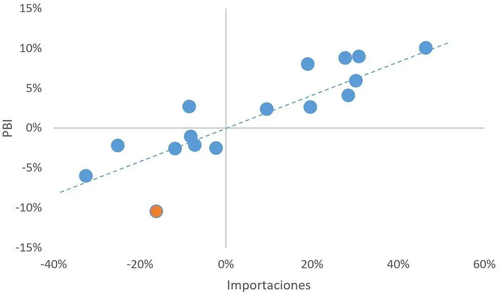 Nota: Para 2020 se estimó una caída del -10,5% anual para el PBI y para las importaciones se utilizó la variación anual del acumulado enero-noviembre. La tendencia lineal utilizada excluye la observación de 2020.