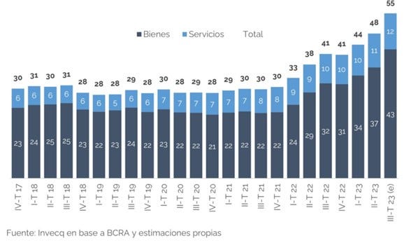 – Deuda con empresas importadoras. Frente a la falta de divisas, y para evitar una reducción muy fuerte de las importaciones que frenase la producción, el BCRA lo que hizo fue permitir el ingreso de los productos importados, pero postergando la entrega de los dólares -a precio oficial- a 90 días (lo cual, en muchos casos, no cumplió). Esto provocó un incremento muy importante de la deuda comercial de las empresas importadoras, que en la actualidad se ubica en torno a los USD 55.000 millones, aunque hay que hacer algunas aclaraciones al respecto. En primer lugar, por cuestiones de plazos entre que se realiza la compra y se efectúa el pago, siempre existió este tipo de endeudamiento. Como muestra este trabajo de la consultora Invecq, la misma históricamente se ubicó en torno a los  USD 30.000, con lo cual, el “nuevo” endeudamiento sería por alrededor de USD 25.000 millones.