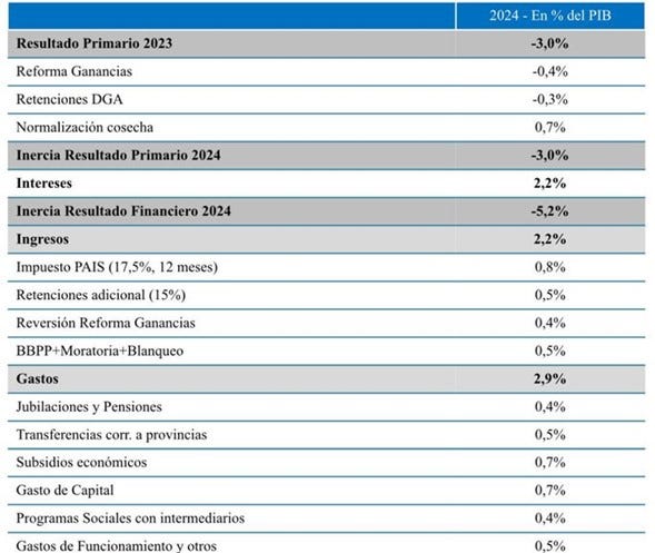 Con el correr de las horas fue apareciendo nueva información, aunque la mayoría sin estar respaldada por confirmaciones oficiales (salvo un tweet del Ministerio de Economía en el que mostraron la magnitud de los recortes y los aumentos de impuestos estimados para lograr el equilibrio fiscal en 2024). De esta manera, y tal como se desprende del cuadro a continuación, el gobierno estima que el déficit fiscal heredado será de 5,2% del PIB y allí se puede ver qué impuestos se incrementarán y qué gastos se recortarán para lograr reducirlo en su totalidad para fin del año que viene.