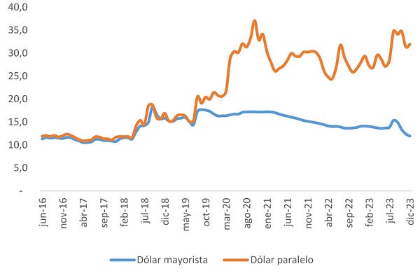 Dólar blue y tipo de cambio mayorista (en términos reales)