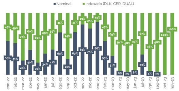– Vencimientos de deuda en pesos. Acá la principal cuestión es que el 98% de la deuda que vence el año que viene, que asciende a unos $35,5 billones (USD 36.000 millones valuados al tipo de cambio financiero), está indexada, ya sea a la inflación o al tipo de cambio oficial. Con lo cual, las medidas recientemente anunciadas (ver más adelante) y la magnitud del impacto que tengan en los precios automáticamente se traducirán en un incremento de estos vencimientos (manteniendo su valor en términos reales). No obstante, hay que destacar que alrededor del 65% de esta deuda se encuentra en manos del propio Estado, con lo cual su impacto es menor.