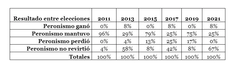 Hay 4 categorías de resultados entre elecciones. Si el peronismo ganó, significa que recuperó el distrito en la elección siguiente luego de haber perdido las PASO. Si el peronismo mantuvo, entonces ganó en ambas. Si el peronismo perdió, quiere decir que a una victoria en la primaria le siguió una derrota en la legislativa o en la general. Si el peronismo no revirtió, quiere decir que perdió en ambas. Las dos primeras categorías son positivas en términos de desempeño electoral porque quiere decir que, al momento de asignar los cargos en juego, las distintas listas compañeras ganaron. Las dos segundas son negativas en términos del desempeño porque o bien al peronismo se la dieron vuelta o bien la marcha no alcanzó para hacerlo. Si volvés a ver la tabla, entonces vas a ver que nunca perdió más del 25% de las provincias, situación que ocurrió en el disperso 2017 de la hegemonía cambiemita. De hecho, en el resto de las elecciones, nunca le ocurrió en más del 20% del territorio nacional.