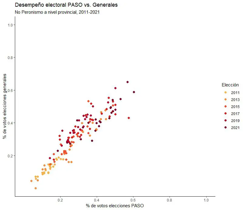 En el no peronismo (UDeSo, UCR y aliados, Cambiemos, JxC) la evolución es similar. Esto no quiere decir que al peronismo le impacte negativamente, si no que el efecto de la regla institucional es igual para ambos espacios políticos con identidades bien diferenciadas. De hecho, la única salvedad que se puede hacer al comparar ambos gráficos es que el desempeño electoral de las fuerzas no peronistas arranca desde más atrás en el gráfico (más cerca de 0) y el peronismo desde más arriba (más lejos de 0). Lo cual, nuevamente, indica una potencia electoral diferencial y compañera. La nota negativa en esta comparación es más bien del presente. Los puntos oscuros del no peronismo están más arriba y los más claros más abajo. Esto indica una mejora cronológica sostenida del espacio cuando empezó a tomar forma Cambiemos. Se pueden distinguir claramente los momentos y las elecciones con el correr de los años. En el caso del peronismo, hay un popurrí más mezclado con los más claros más alejados de 0. Esto quiere decir que en el pasado hubo mejor desempeño, y en el presente no tantos.