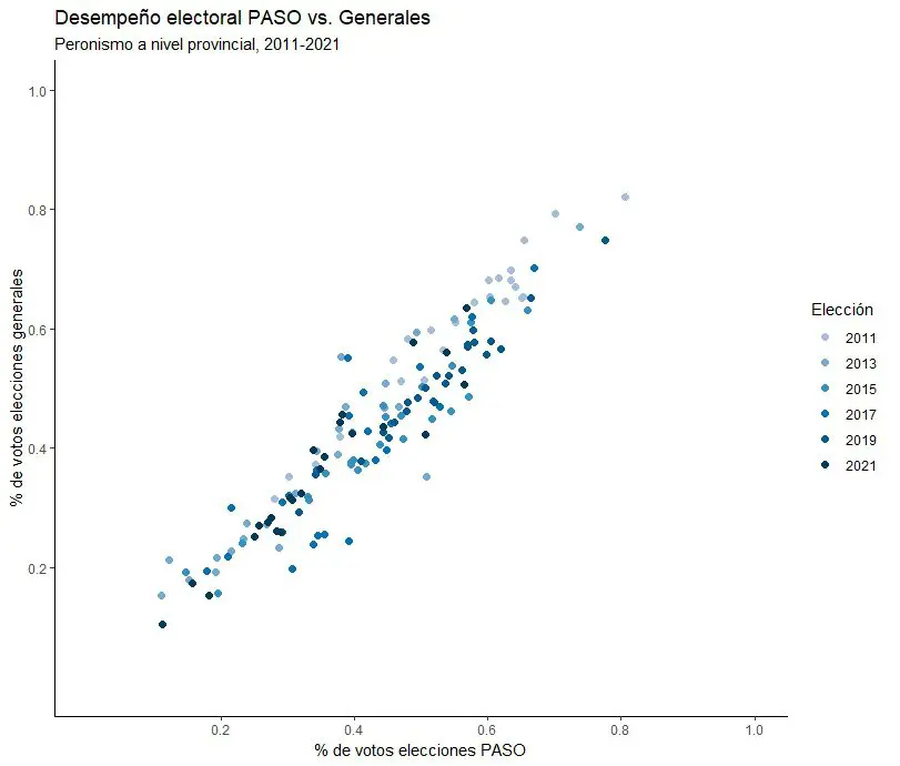 Como podés ver, el gráfico distingue entre las distintas rondas electorales del 2011 hasta 2021 en intensidad de azules. Cada punto muestra el cruce entre el % de votos logrado en las PASO y el % de votos alcanzado en la elección general inmediata en una provincia determinada. Si el peronismo perdiera votos entre las PASO y generales, entonces la inclinación de los puntos de todas las elecciones analizadas debería ser más horizontal. En cambio, la tendencia en 6 rondas electorales en los 24 distritos es bien marcada y ascendente. No hay una pérdida generalizada de votos. En todo caso, un goteo que derrama en algunas situaciones particulares y bien singulares. No es siempre, no son todas. Es a veces, en unas pocas.