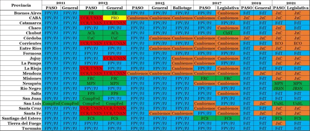 En la tabla a continuación sinteticé qué fuerza política ganó en cada distrito del país desde 2011 a la fecha, discriminando entre PASO y generales en años presidenciales (2011, 2015 y 2019), y entre PASO y legislativas (2013, 2017 y 2021). También incorpora el único ballotage de nuestra historia (2015). En color celeste se muestra la victoria del peronismo en sus diferentes formas (PJ, FPV/PJ, FdT), en rojo las de la UCR cuando compitió sola o en coalición pre-Cambiemos, en amarillo igual para el PRO, en naranja Cambiemos/JxC y en verde distintas fuerzas de corte provincial con sus respectivas siglas.