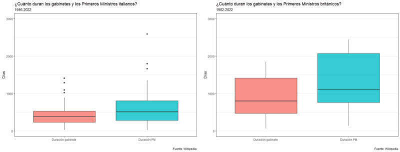 Si estás viendo lo mismo que yo, verás que los primeros ministros y los gobiernos (gabinetes ministeriales) de Italia duran menos días que los de Reino Unido. Las “cajas” italianas están por debajo de los 1.000 días (2,7 años), mientras que las británicas están por encima y tocando los 2.000 días (5,4 años) en el caso de sus líderes de gobierno. Las medianas en las primeras están cerca de 500 días (1,3 años) y en las segundas a más del doble de días (y doble de años). De modo que se corrobora lo que pensamos diariamente, que los tanos tienen gobiernos y gobernantes que alquilan por menos tiempo los sillones que los brits. Todo esto es muy lindo porque ambos sistemas políticos tienen elecciones cada cinco años según sus normas, pero en la práctica el funcionamiento es distinto. Regularidades te da la vida, no sorpresas.