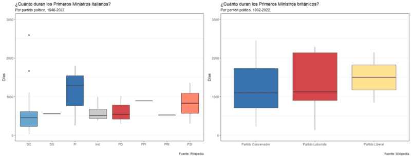 Ahora que ya venís entrenado seguro lo sacaste fácil. En Reino Unido, a la derecha, los tres partidos más o menos duran lo mismo. Las medianas están en torno al mismo valor, con una leve ventaja para los del Partido Liberal. Esto puede deberse a que tuvieron menos gobiernos en la base analizada, dado que cayeron en picada cuando entró el Partido Laborista en el juego político de las islas. Éstos, por su parte, tienen una variación un poco más extensa que el Partido Conservador porque la caja se estira un tantito más. Pero, en términos generales, los tres son bastante parecidos. No así en Italia. Todos más o menos duran lo mismo: poco. Fijate que las cajas tienen una ubicación similar a las del primer gráfico y están por debajo de las de Reino Unido. Pero hay un caso que despunta y sobresale por encima de sus pares. Es FI, que es Forza Italia. Forza Italia es Silvio Berlusconi. Berlusconi es el más británico de los italianos. Su liderazgo en el gobierno duró más o menos lo mismo que los primeros ministros de Reino Unido. Es el único que destaca.