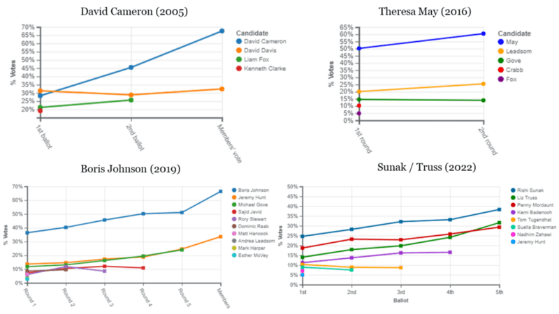 La cosa es así. Cuando se activa el proceso eleccionario, primero votan los parlamentarios conservadores que tienen asiento. No se mete ningún otro partido por obvias razones. El Comité 1922 del Partido Conservador, el mismo donde se decidió la suerte de El Boris en junio pasado, es el que define las reglas del juego. Los nominados que quisieron se auto postularon y fueron aceptados hasta el 12 de julio. Cada uno y una tuvo que reunir firmas de 20 parlamentarios. Jonhson no pudo participar. Pobre proscripto. A partir de ahí, se fueron realizando distintas votaciones cerradas para votar a favor de quienes se presentaron. Todos y todas con lemas, logos de campaña y fotos muy profesionales. En la primera ronda, el 13 de julio, todos los que superaron los 30 votos se quedaron. Los que no, afuera. A partir de ahí, se fueron realizando sucesivas votaciones (14, 18, 19 y 20 de julio) hasta que quedaron solamente dos en carrera. Quienes fueron quedando últimos, afuera. Acá te lo explican con un gráfico muy lindo y muy british.