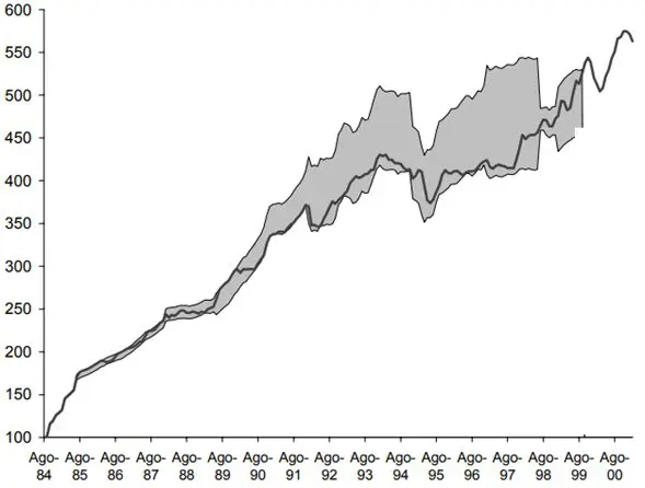 Al margen de lo anterior, el esquema fue sumamente exitoso. Entre 1984 y 1987, el PBI creció a tasas anuales superiores al 4%, y durante los noventa promedió un crecimiento cercano al 7% anual. La inflación, que partía de niveles superiores al 20%, fue descendiendo de manera sostenida hasta ubicarse en 3,3% en 1999. El esquema de bandas permitió una desinflación gradual pero sostenida, sin recurrir a un tipo de cambio fijo que expusiera a la economía a nuevos shocks externos. Además, las exportaciones crecieron de manera significativa, lo que ayudó a que el déficit de cuenta corriente sea moderado. En septiembre de 1999, el Banco Central decidió eliminar la banda y pasar a un régimen de flotación limpia, en el marco de un esquema formal de metas de inflación. De este modo, la banda cumplió su función como mecanismo de transición.