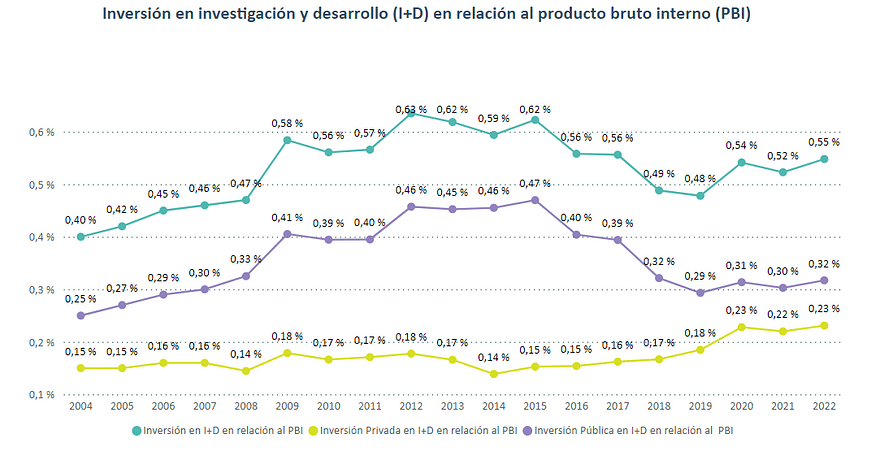 Se pone más interesante aún cuando se observa la dinámica de estas series. Pese a que nos parezca bajo el porcentaje del PBI invertido en I+D, con respecto al inicio de los 2000 creció bastante. En algunos momentos fue mayor (en 2012 alcanzó el 0,63%), en otros menor, y también cambió la participación pública y privada en el período. Esto nos habla de la vinculación que existe entre las políticas llevadas adelante por los distintos gobiernos para impulsar la inversión en I+D o darle menos bola, así como también a la forma que se le da a ese impulso. En ese sentido, si los momentos de alta inversión pública son acompañados por el sector privado, este gasto puede quedar trunco, por lo que se requiere la complementariedad entre los actores. En este tablero pueden ver algunos datos más y actualizados a la fecha.