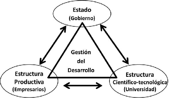Los vértices del triángulo se componen por el Estado, que articula las políticas y los fondos requeridos para desarrollar las actividades científicas y tecnológicas, así como también de establecer las normas de funcionamiento en las que se desenvuelve el sector productivo; la estructura científica-tecnológica encargada del sistema educativo, la puesta en marcha de los proyectos de investigación, su evaluación y la coordinación entre los diferentes actores que participan en él; y el productivo que toma los avances científicos realizados por el anterior vértice y lo aplica en su mundo, logrando lo que conocemos como innovación en base a la ciencia. Como este párrafo no le hace justicia al planteo, te dejo el trabajo en este link, cosa de que lo chusmees si te interesa.