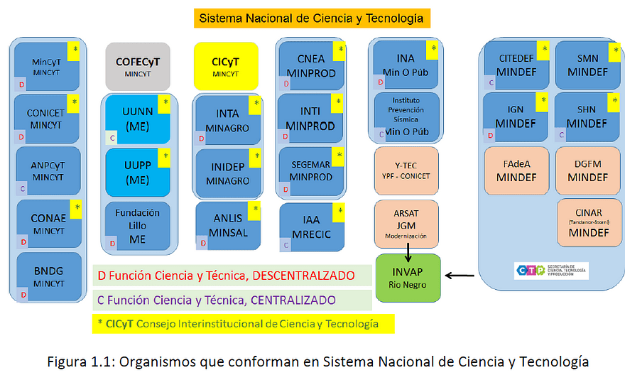 Finalmente, quizás te preguntes quién hace todo esto. Muchas veces nos quedamos con que es el CONICET el único engranaje del sistema científico y tecnológico, pero la realidad es bastante más compleja. El sistema de ciencia y tecnología se compone de universidades, institutos tecnológicos (ejemplo: INTI e INTA), organismos y fondos de ministerios nacionales, laboratorios y tantos otros. Jorge Aliaga, físico, investigador y exsecretario en el Ministerio de Ciencia y Tecnología, sintetizó hace unos años este complejo ecosistema en este cuadro, que sirve para tomar conciencia de lo amplio y abarcativo que es nuestro aparato de CyT.