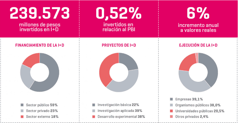 En Argentina, la mayor parte del financiamiento de la I+D proviene del sector público, a través de sus universidades y organismos, así como también de subsidios y créditos para su realización por parte del sector privado. En 2021, la inversión total en I+D fue del 0,52% del PBI, bastante menos que los países desarrollados (el promedio de la Unión Europea es de 2,8%, de los países de OECD 3,01% y en Asia Pacífico 2,71%), pero dentro de todo estaba en línea con la región (América Latina 0,62%).