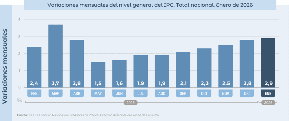 La inflación en Argentina fue bajando desde diciembre de 2023 (cuando fue 25,5% mensual) hasta el 1,5% mensual de mayo pasado. Luego subió de manera ininterrumpida en los 8 meses posteriores hasta alcanzar el 2,9% de enero.