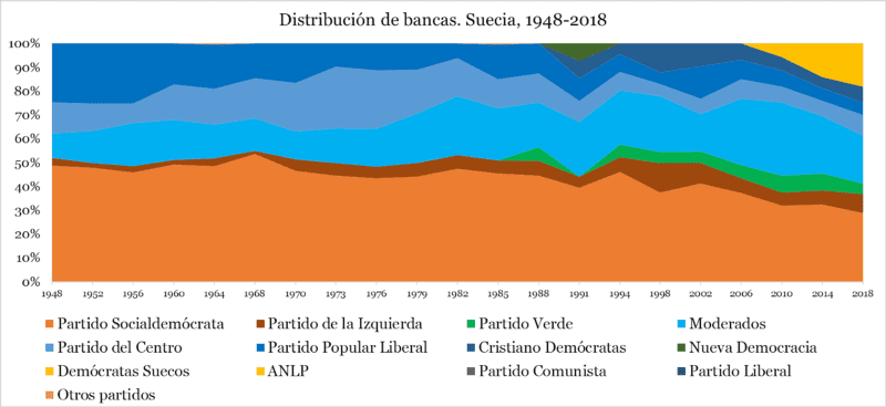 Y mirá si no. Acá te dejo, a modo de cierre, un gráfico que hice un día para una clase y que cada tanto refloto. Podés ver dos cosas. Primero, la poca cantidad de partidos que han entrado en el Riksdag. Lejos de Países Bajos. Segundo, que los socialdemócratas han ido cayendo recientemente en cantidad de bancas, pero eso no les quita centralidad en la política sueca.
