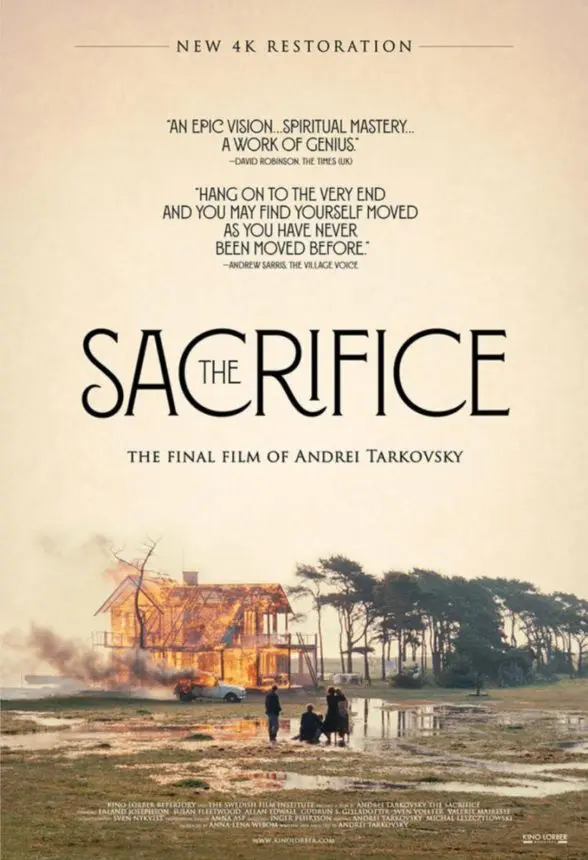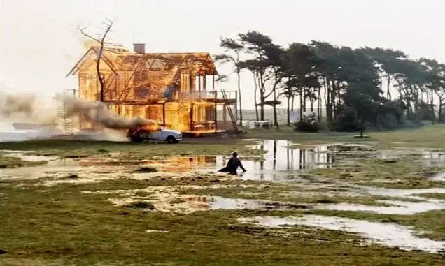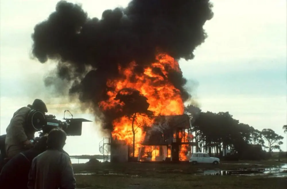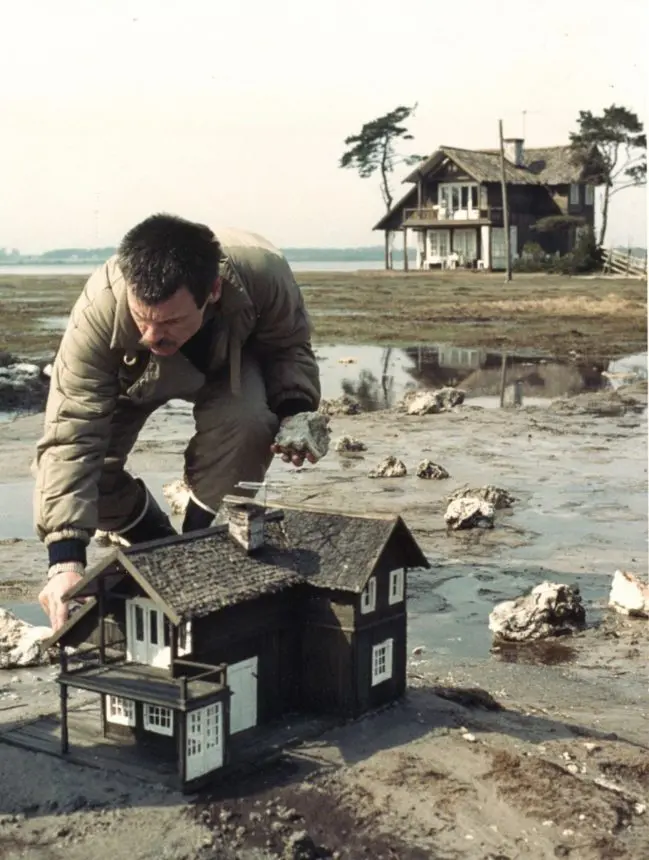 Más abajo pueden ver una foto de Tarkovski con una maqueta de la casa que se ve atrás, estudiando todos estos aspectos antes de dar mecha y gritar “¡Acción!”. Cuenta la leyenda que, efectivamente, la primera vez que lo filmaron algo salió mal. Dejaron pasar algunos días y reconstruyeron la casa para poder volver a rodar. Acá les dejo acá la secuencia entera de la película, de unos seis minutos, en la que se ve el incendio total y la coreografía casi danzada de los personajes: Alexander quema todo y su familia justo vuelve del bosque y encuentra la devastación misma. En sus cuerpos está la desesperación de ver que todo arde y no poder hacer nada filmada con distancia, como si fuéramos espectadores de la tragedia de otros. En esta última escena, en vez de los bomberos, aparece una ambulancia y se lleva a Alexander a un manicomio. El sacrificio se consumó y la casa se derrumba por completo ante nuestros ojos. No se me ocurre un final más contundente para una carrera cinematográfica como la de Tarkovski, que ganó varios premios en Cannes por esta película y no pudo ir a retirarlos porque estaba con un cáncer avanzado que lo consumió por completo, como este fuego que ensayó muchas veces.