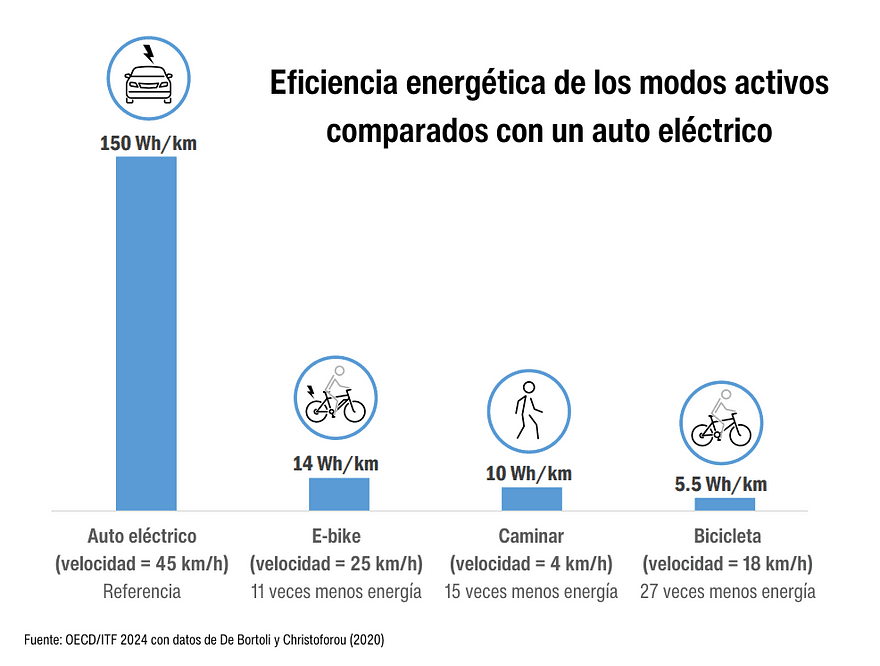En ese sentido, caminar, ir en bici o apostar por las bicicletas eléctricas podrían ser inmensamente más eficientes que manejar un auto eléctrico. Así lo explica el gráfico proveniente de un nuevo paper del Foro Internacional de Transporte (ITF) de la Organización para la Cooperación y el Desarrollo Económicos (OCDE):