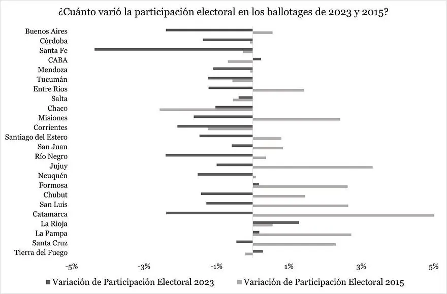 El gráfico de barras muestra cuánto varió porcentualmente la participación electoral por provincia. Está ordenado de las de mayor peso electoral a las de menor. Si la barra va para la izquierda, entonces la concurrencia a los establecimientos de votación cayó. Si va para la derecha, subió. En términos generales, el promedio de variación de la participación electoral en 2023 fue de -1,13% y en 2015 fue de 0,88%. Muy marginal, imperceptible prácticamente. A eso se suma que la escala del gráfico va de -5% a 5%, lo que indica que, aunque veas barras muy largas y otras muy cortas, las diferencias son mínimas entre pares de elecciones.