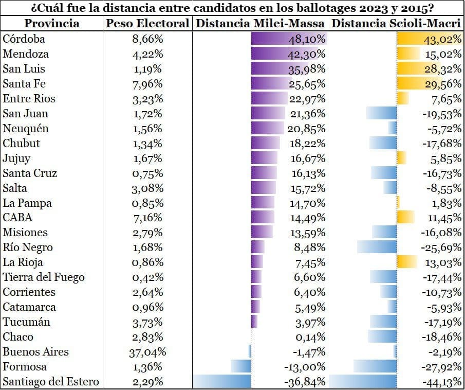 Otro dato interesante es que en las provincias donde el candidato liberal-libertario sacó más de 15 puntos de ventaja votó casi el 35% del padrón electoral nacional (desde Córdoba hasta Salta inclusive en la tabla). En 2015 los 4 distritos que le dieron esa distancia o una mayor a Cambiemos representaron solo el 22% de los electores nacionales. A eso se suma que, mientras que en este 2023 el peronismo solo logró esa ventaja en Santiago del Estero (2,29% del padrón), en 2015 lo hizo en 9 provincias que representaron casi el 19% de los electores nacionales.