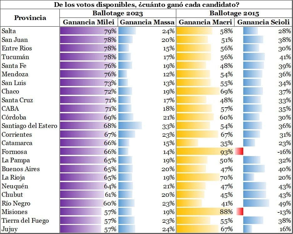 Como podés apreciar, el líder supremo de LLA obtuvo entre la mitad y tres cuartas partes de todo lo que había quedado dando vueltas en la primera vuelta presidencial de octubre. Esto es algo que ya te contamos con el “politólogo” Blas Lantos el lunes pasado, solo que aquella vez hicimos foco en el apoyo de la base electoral cambiemita nomás. Ahora podés ver que también se fueron varios indecisos atrás de las mechas del león. Massa, en cambio, apenas rondó el tercio de los disponibles, con variaciones más bien menores entre distritos. De hecho, el promedio de pesca de Milei fue de 68% mientras que el del candidato peronista se ubicó en el 19%. Una distancia abismal.
