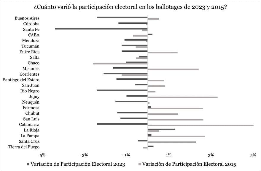 Vos dirás que tal vez el cambio en la participación electoral entre elecciones fue clave para que esto ocurriera. Pero no es por ahí. Es cierto que en 2015 votó más gente que en las dos rondas de 2023, tanto en la primera (81,07%) como en la segunda vuelta (80,77%). Pero la variación provincial de la participación electoral no fue muy distinta si comparamos los dos pares de elecciones. Mirá.